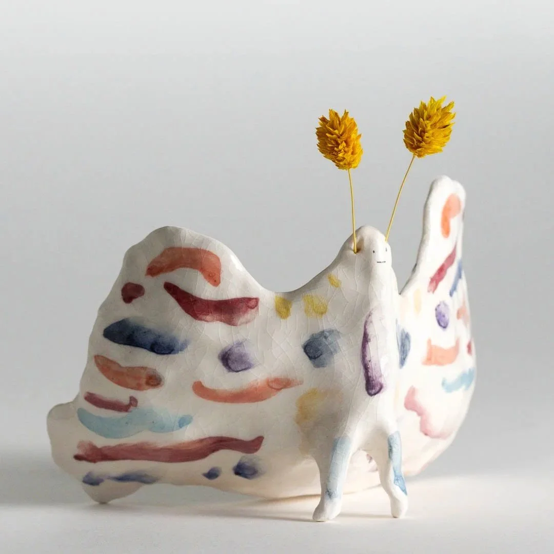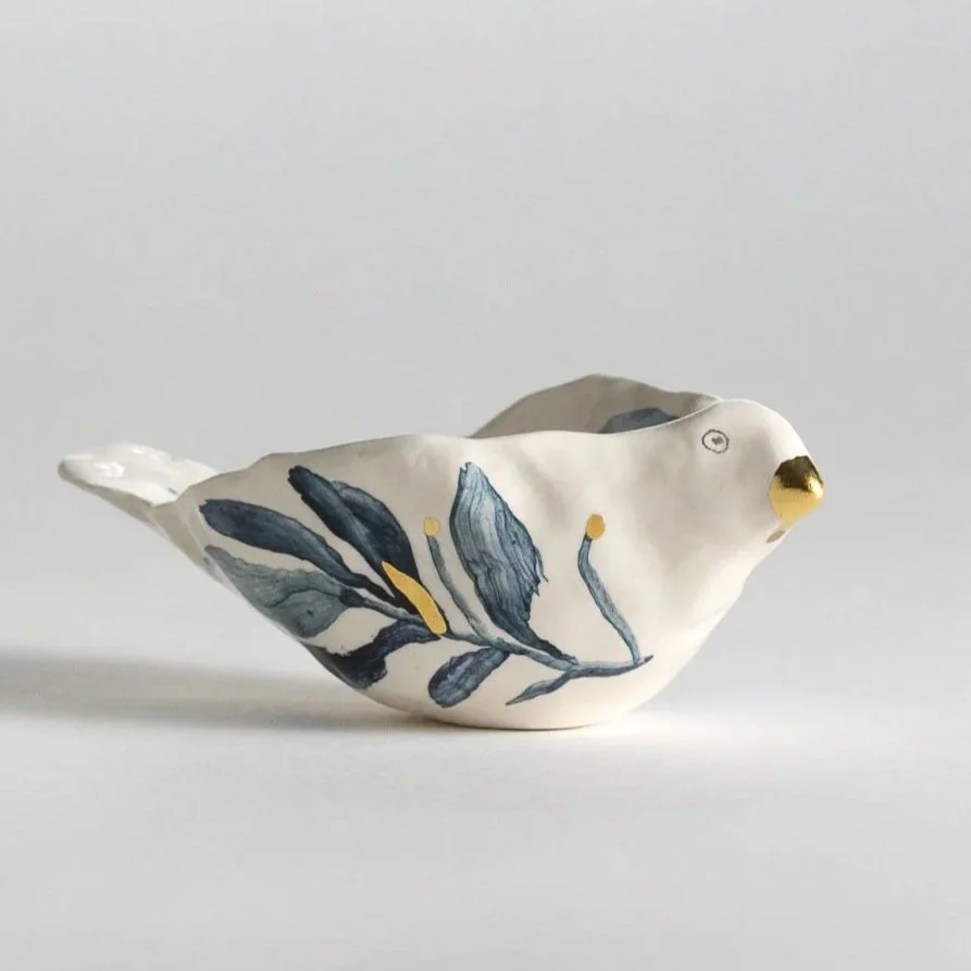Working with porcelain can be challenging, but I’m drawn to the way it holds gesture and the way loose underglaze washes settle on its surface.
